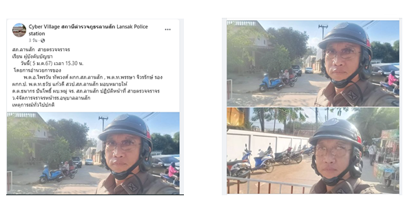วันที่ 5 ม.ค.67 เวลา 15.30 น. ด.ต.ธนากร ปันโพธิ์ ผบ.หมู่ จร. สภ.ลานสัก ปฏิบัติหน้าที่ สายตรวจจราจร ว.4จัดการจราจรหน้ารร.อนุบาลลานสัก เหตุการณ์ทั่วไปปกติ