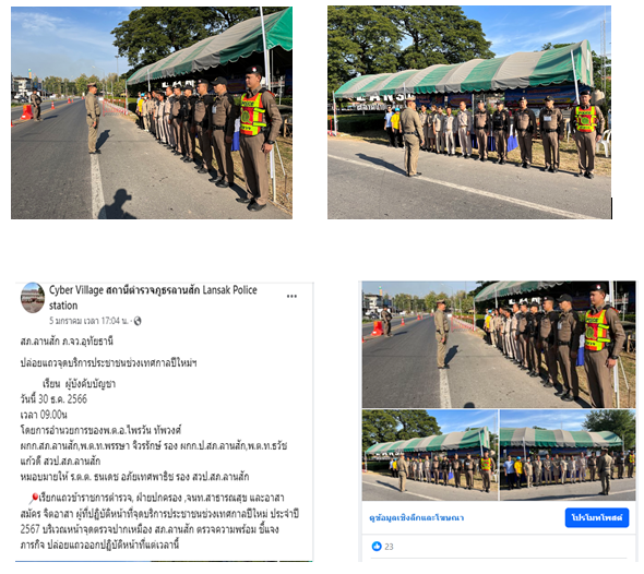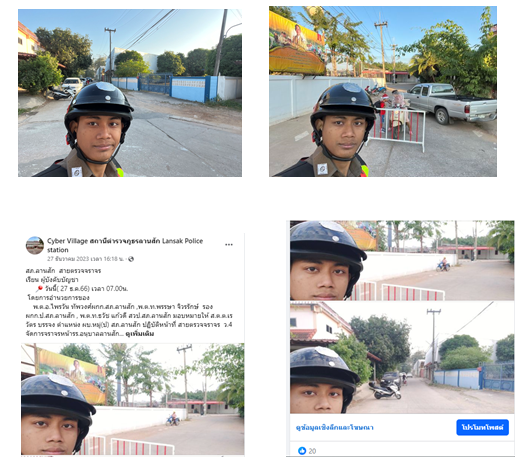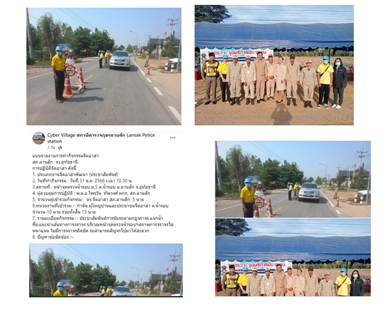 วันที่ 31 ธ.ค. 2566 เวลา 10.30 น. ตร.จิตอาสา สภ.ลานสัก 5 นาย กำนัน ผู้ใหญ่บ้านและประชาชนจิตอาสา ต.น้ำรอบ จำนวน 10 นาย รวมทั้งสิ้น 15 นาย ประชาสัมพันธ์การขับรถตามกฎจราจร,แจกน้ำดื่ม,แนะนำเส้นทางการจราจร บริเวณหน้าจุดตรวจน้ำรอบ