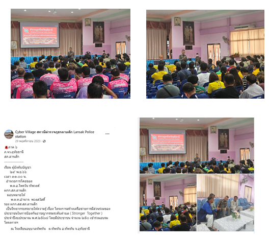 วันที่ 29 พ.ย.๖๖  เวลา 11.00 น. พ.ต.ท.อำนาจ พวงสวัสดิ์  รองผกก.สส.สภ.ลานสัก  เป็นวิทยากรบรรยายให้ความรู้เรื่อง โครงการสร้างเครือข่ายการมีส่วนร่วมของประชาชนในการป้องกันอาชญากรรมระดับตำบล ( Stronger Together)